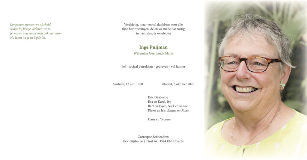 Deze week ontvingen we het verdrietige bericht van het overlijden van ons oud-bestuurslid Inge Puijman. Inge was een van de initiatiefnemers van Lunetten Wil Wel en was tot 2019 actief betrokken als bestuurslid en organisator van onze activiteiten.